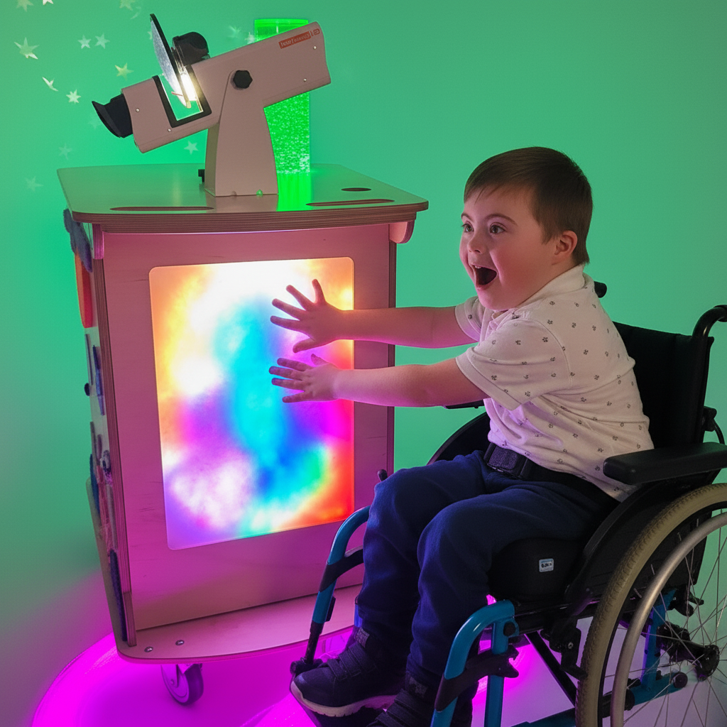 Solar Sensory Projector: A lamp‑free, whisper‑quiet LED powerhouse that matches the brightness of the Solar 250. It features built-in switch sockets for ON/OFF and wheel control, projecting across walls, small focal areas, or via mirrors—ideal for thematic storytelling, literacy, numeracy, and creative visual effects.
