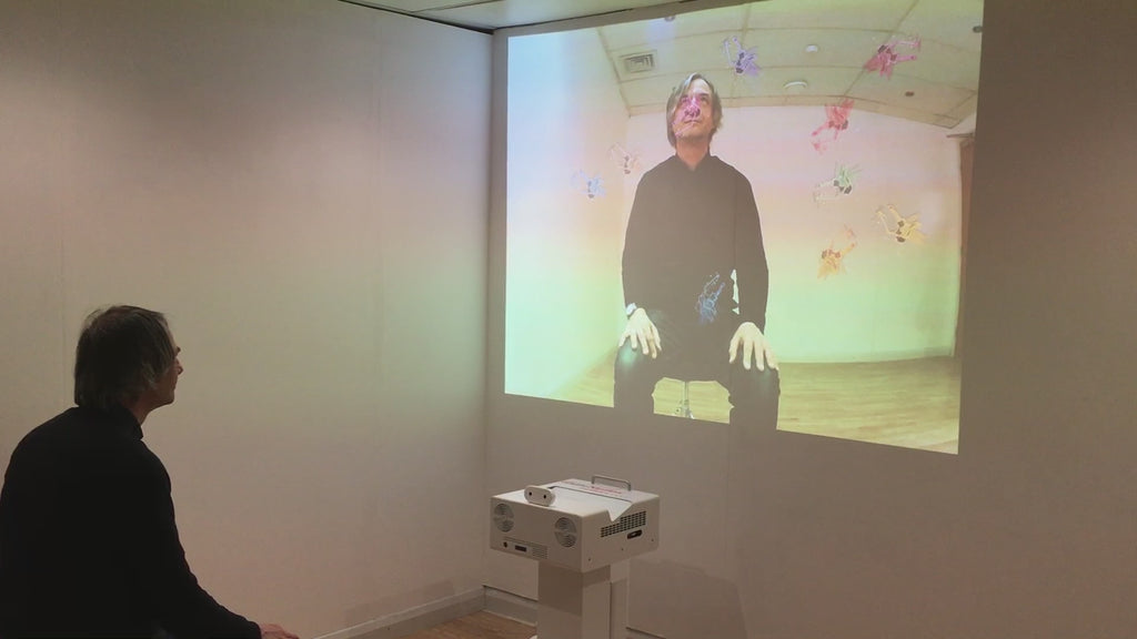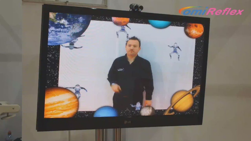 The omiReflex system offers an enchanting experience for children, displaying a mirror image of them with dynamic, interactive effects such as scattering stars, painting pictures, playing drums, and even traveling through space. This projection can be displayed on any pale vertical surface and the omiReflex+ version even allows for personalisation by importing children's own images, sounds, and videos.